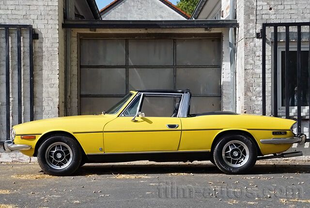 Triumph Stag bei film-autos.com: Sie suchen einen Oldtimer von Triumph aus der Zeit der 1970er Jahre zum Mieten? Dieses Modell Stag stammt aus dem Jahr 1975. Dieses Cabrio / Roadster aus Großbritannien ist in der Außenfarbe gelb, der Innenraum ist schwarz. Bei diesem Oldtimer sind kleinere bis mittlere Gebrauchsspuren vorhanden.